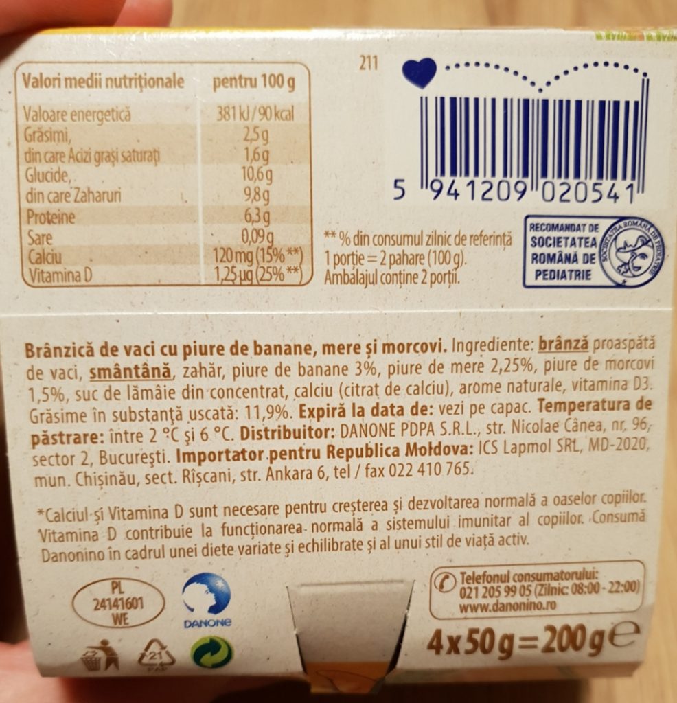 6. Am văzut că menţionezi des în alimentaţia copiilor brânza de vaci. Am descoperit de ceva timp brânzica de vaci de la Danonino cu fructe şi legume şi îi dau lui Luc ca gustare, din când în când, nu doar pentru că nu am timp de gătit zilnic, dar şi pentru că îi place. Mie mi se pare că eticheta lor este curată, nu are E-uri, nu are ingrediente pe care nu le cunosc. În afară de zahărul de care vorbeam mai sus, pe care şi eu îl recomand peste 2-3 ani. În plus, brânzica asta are calciu și vitamina D pentru dezvoltarea oaselor și susţinerea sistemului imunitar. Nu se compară cu ciocolata sau bomboanele. Ție cum ţi se pare brânzica lor?